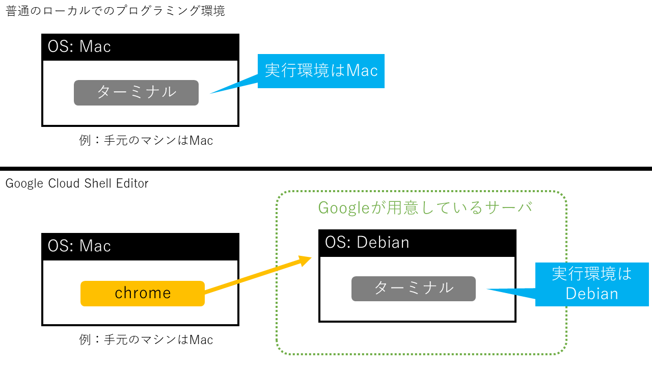 下半分は、皆さんが取り組んでいるリモート環境でのプログラミングを表しています。 ここでは、右側にあるように、Googleのサーバ内にDebianというOSのコンピュータが一台仮想的に立ち上がります。そして、そのコンピュータを、 手元のマックからchromeブラウザを経由して操作します。なので、 手元のマシンのOSはマックであすが、実行環境はDebianです。