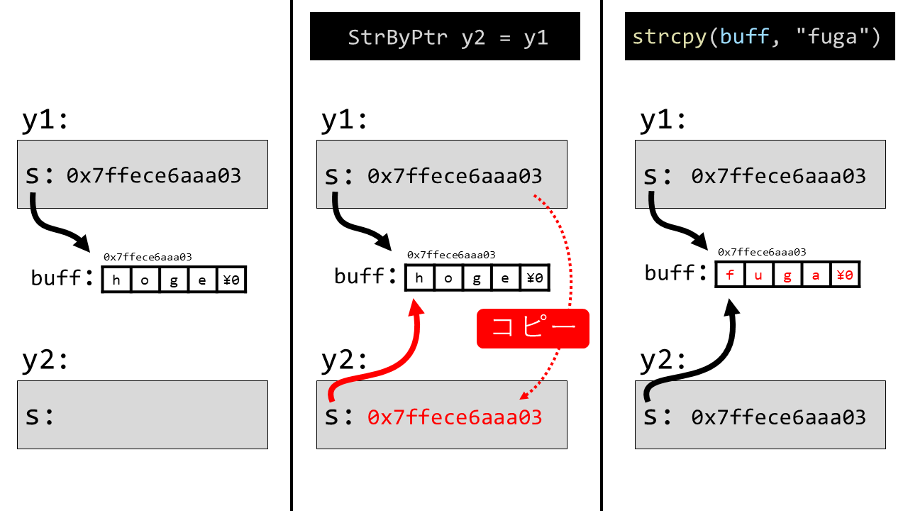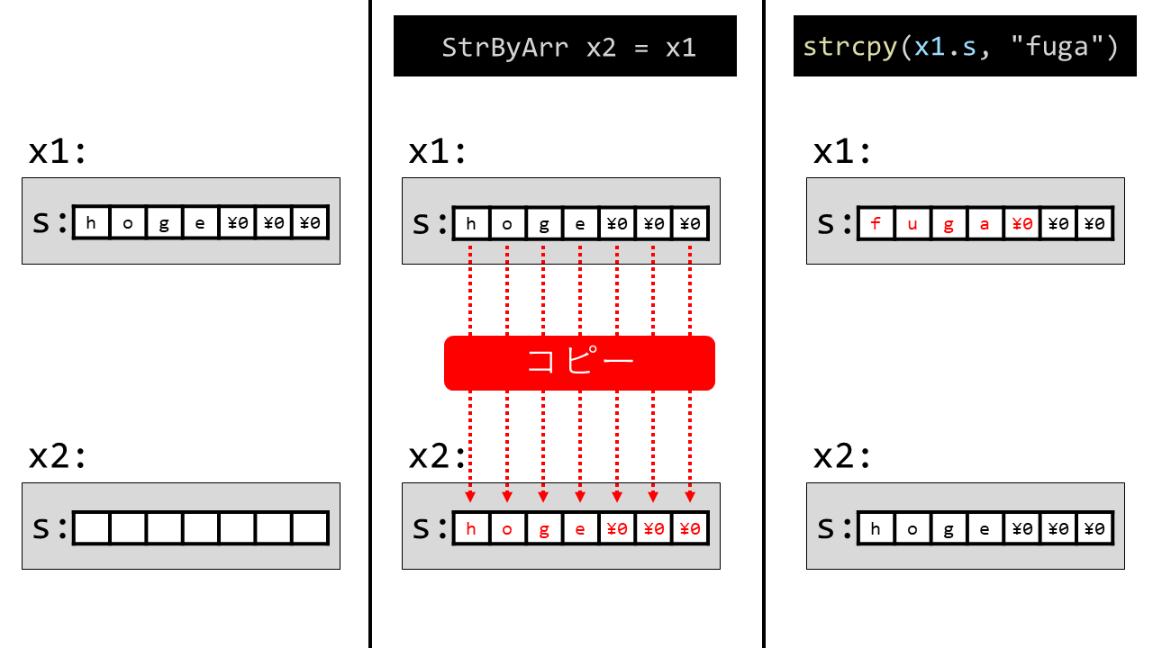 一方で、構造体はコピー可能だと上で述べました。その場合、各メンバ変数がコピーされます。 ここで、構造体が配列をもつとします。ここで構造体をコピーすると、なんと 配列の中身が全て自動でコピーされるのです。 これはポインタが関係するのではなく、全てコピーです。 なので、次の例が示すように、別の構造体にコピーしたあとは、内部の配列はそれぞれ別々です。